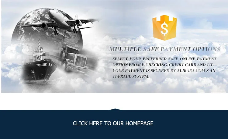 - Alibaba Trade Assurance, including Visa Credit Card, Master Card, TT Bank Transfer,e-checking and Pay-later;